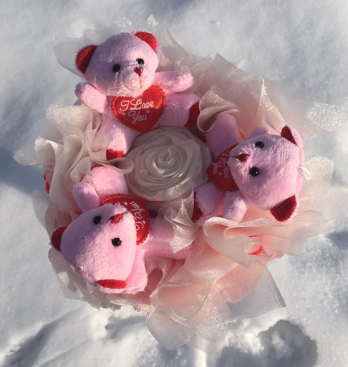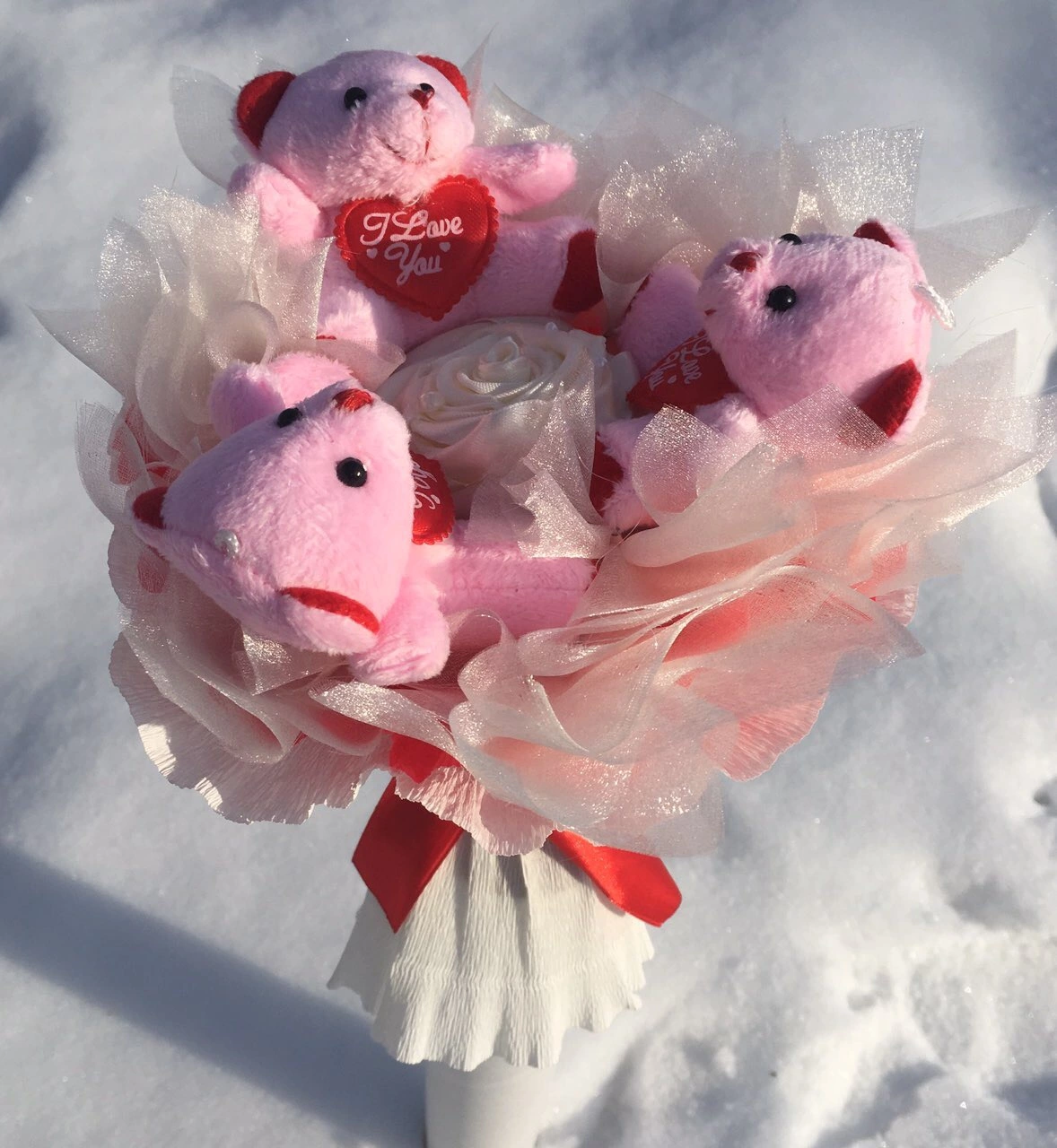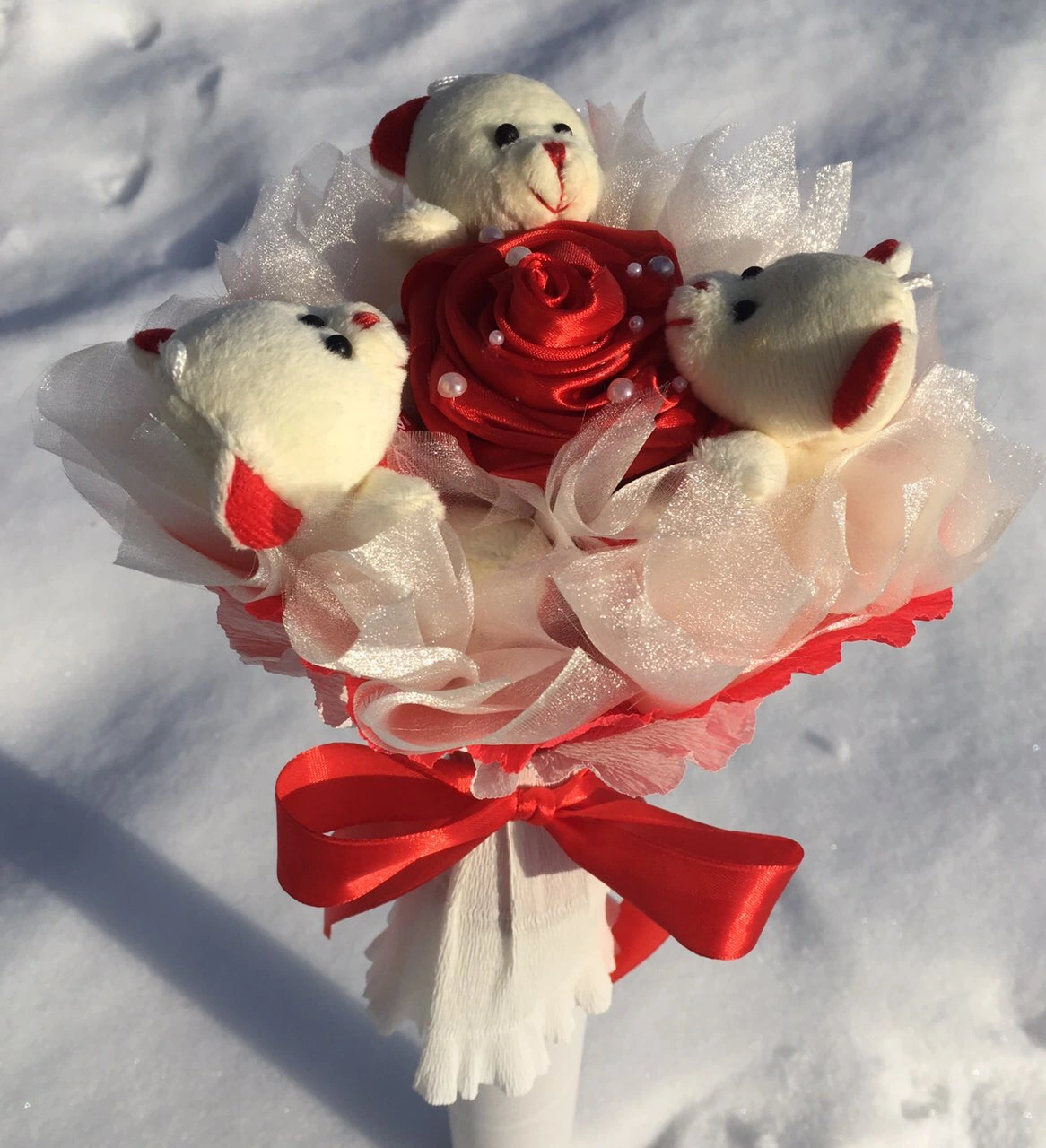 Букет с 3 плюшевыми мишками. Мишка 7 см. В процесе изготовления