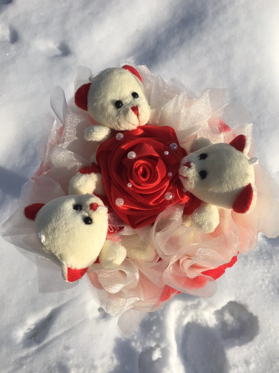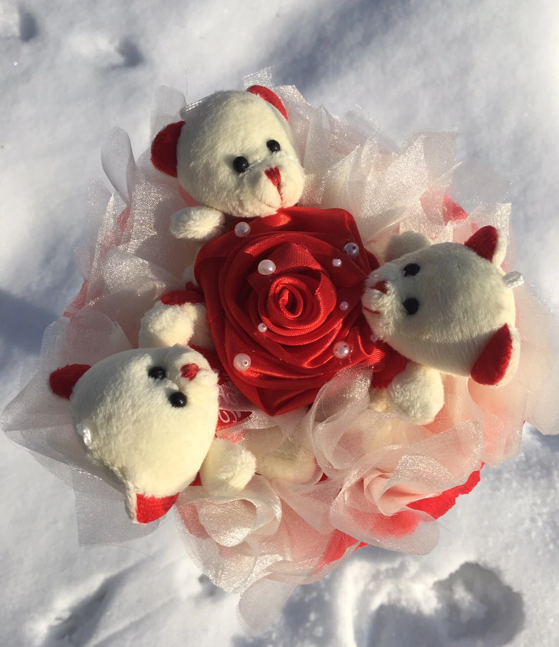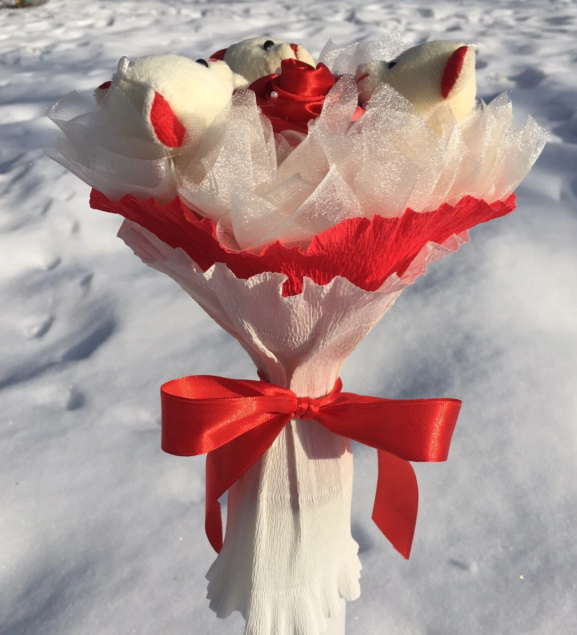 Букет с 3 плюшевыми мишками. Мишка 7 см. В процесе изготовления