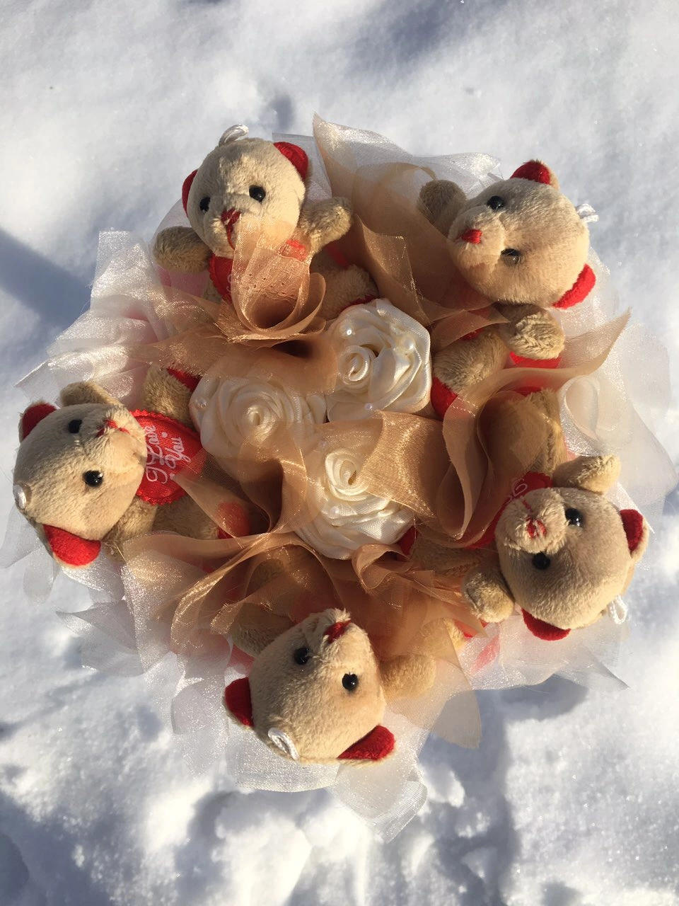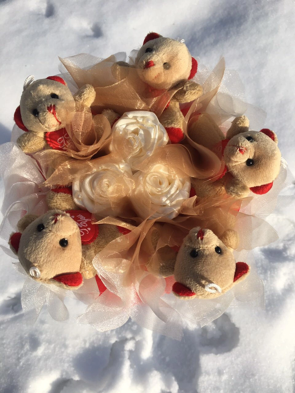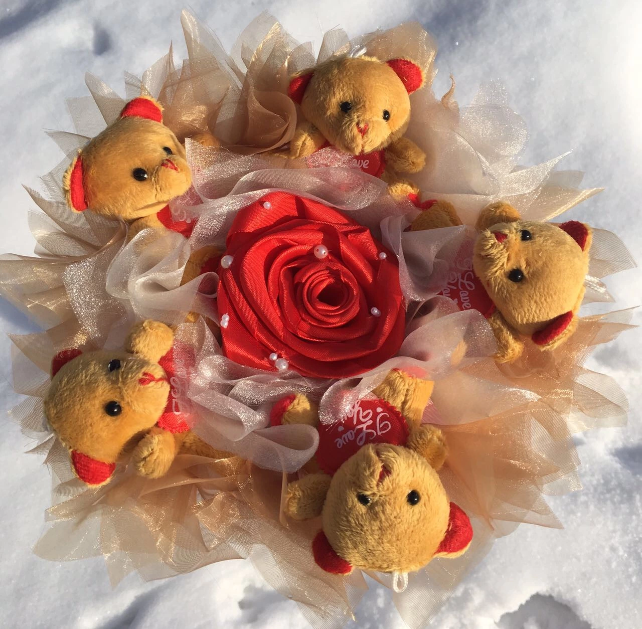 Букет с 5 плюшевыми мишками. Мишка 7 см. В процесе создания