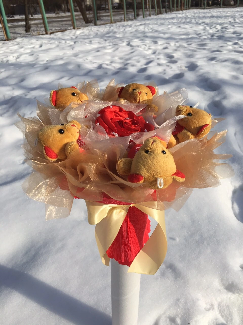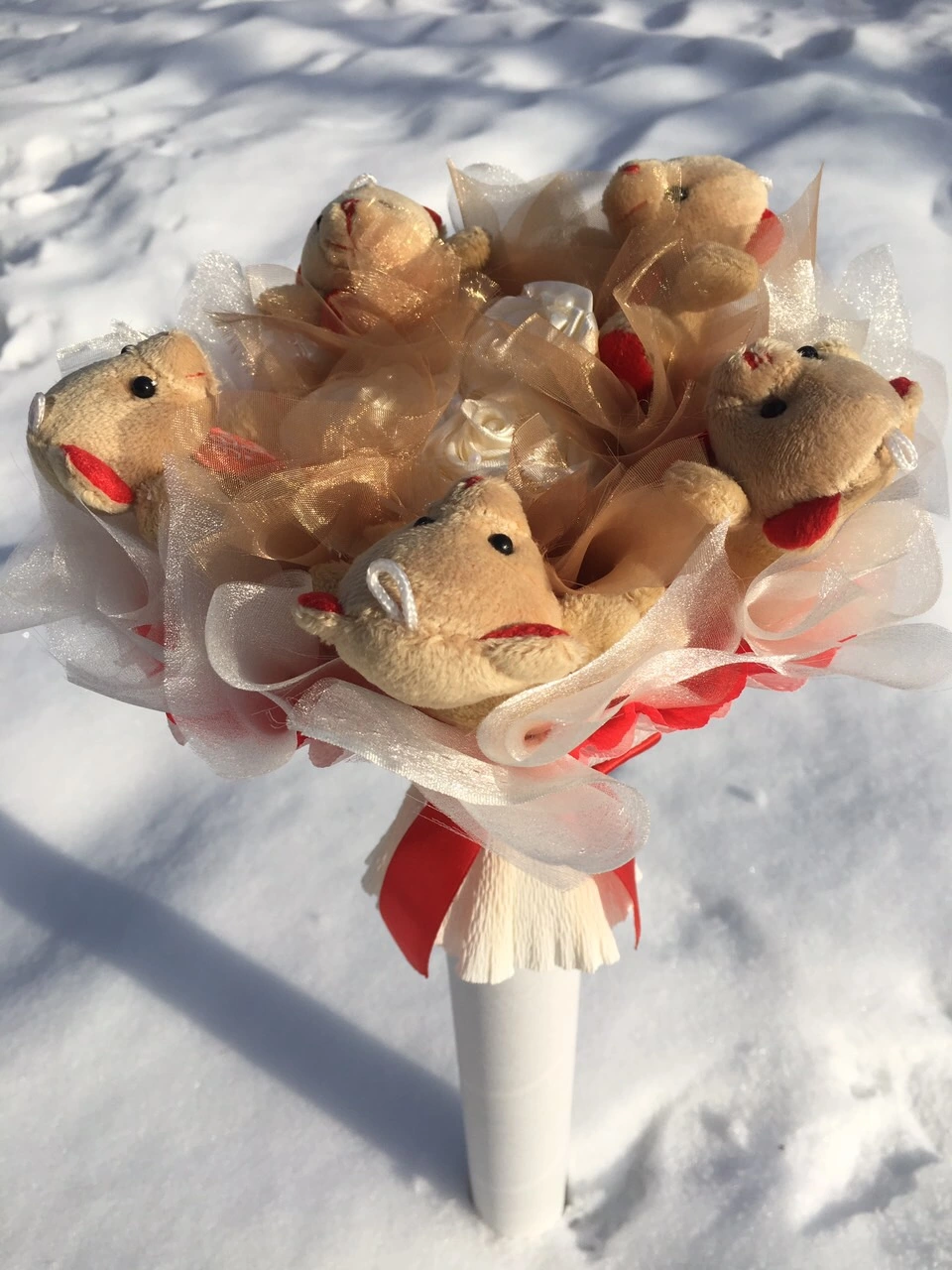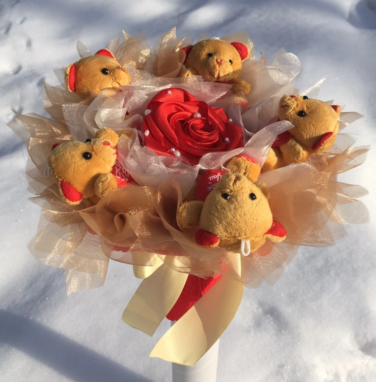 Букет с 5 плюшевыми мишками. Мишка 7 см. В процесе создания